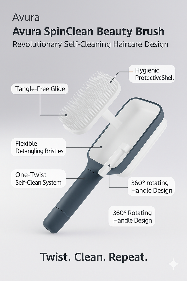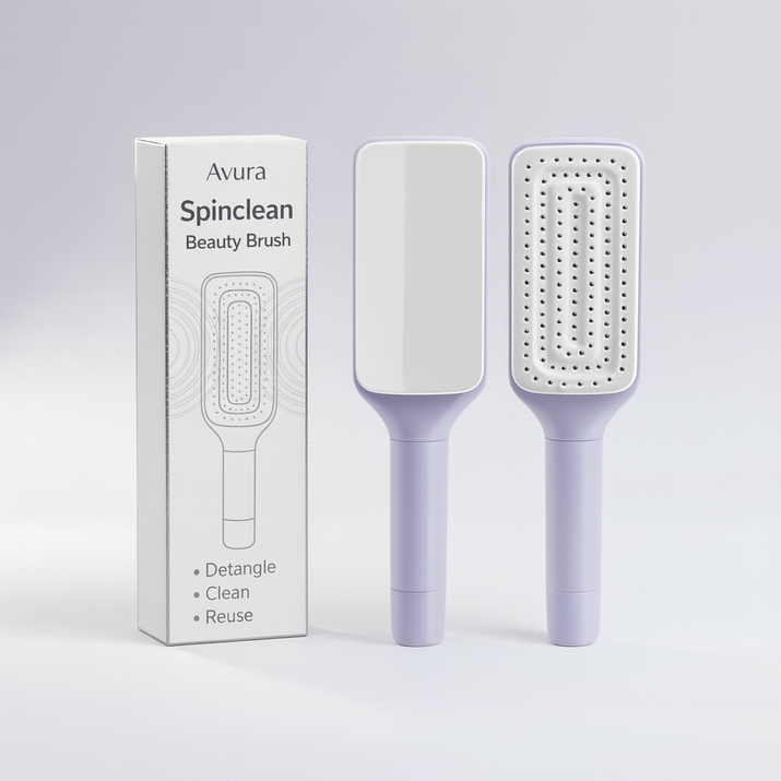 Experience the future of haircare with the Avura SpinClean Beauty Brush — designed with a 360° rotating handle that removes trapped hair in one twist. Say goodbye to clogged bristles and painful tugging, and hello to a smooth, salon-fresh finish every time.